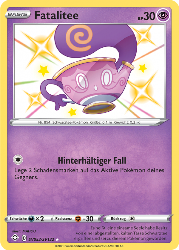 | Kaufen? | Kaufen Sie Ihre Fatalitee Pokemon-Karte aus dem Glänzendes Schicksal - Schillernde Schatzkammer-Erweiterung. |