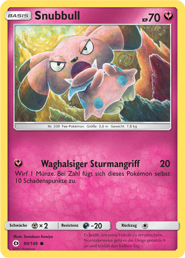 | Kaufen? | Kaufen Sie Ihre Snubbull Pokemon-Karte aus dem Sonne & Mond-Erweiterung. |