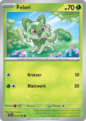 | Kaufen? | Kaufen Sie Ihre Felori Pokemon-Karte aus dem Karmesin & Purpur Promos-Erweiterung. |