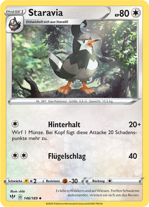 Kaufen? Kaufen Sie Ihre Staravia Pokemon-Karte aus dem Flammende Finsternis-Erweiterung.