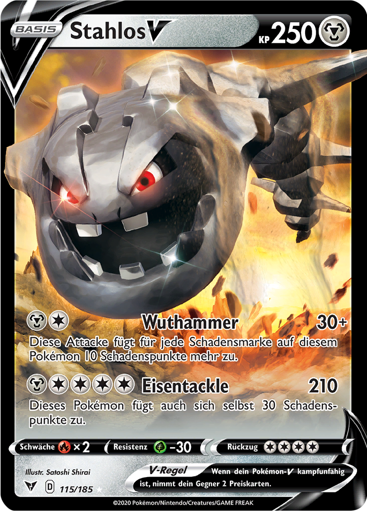 | Kaufen? | Kaufen Sie Ihre Stahlos V Pokemon-Karte aus dem Farbenschock-Erweiterung. |