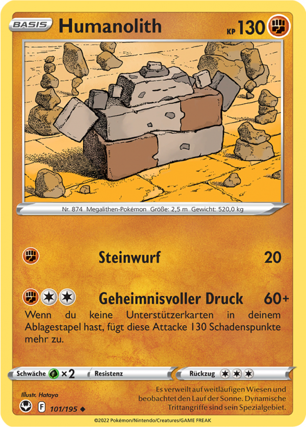 | Kaufen? | Kaufen Sie Ihre Humanolith Pokemon-Karte aus dem Silberne Sturmwinde-Erweiterung. |