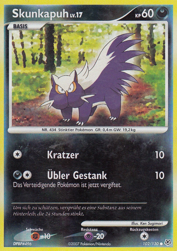 | Kaufen? | Kaufen Sie Ihre Skunkapuh Pokemon-Karte aus dem Diamant & Perl-Erweiterung. |