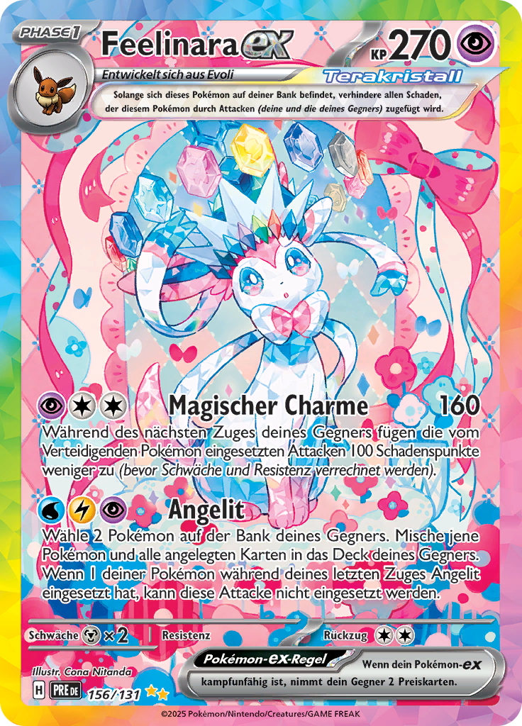 | Karten | Prismatische Entwicklungen besteht aus 180 Pokémon Karten. |