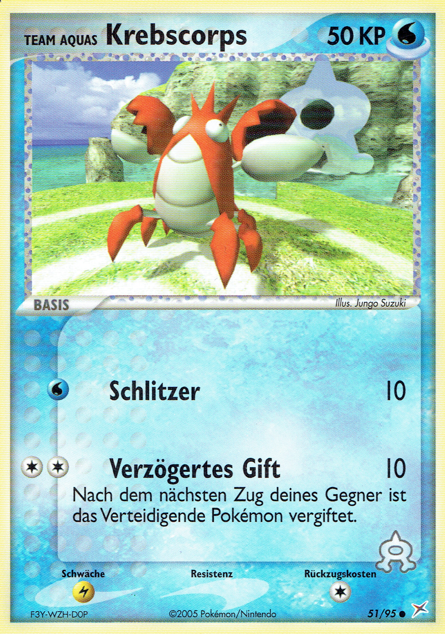 | Kaufen? | Kaufen Sie Ihre Team Aquas Krebscorps Pokemon-Karte aus dem Team Magma vs Team Aqua-Erweiterung. |