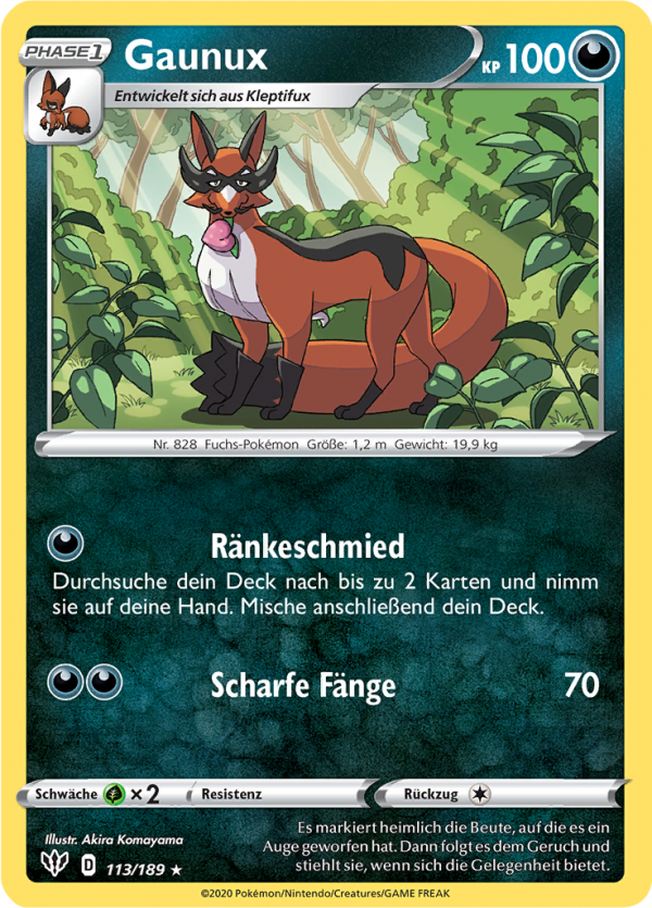 | Kaufen? | Kaufen Sie Ihre Gaunux Pokemon-Karte aus dem Flammende Finsternis-Erweiterung. |