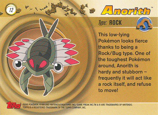 This low-lying Pokémon looks fierce thanks to being a Rock/Bug type. One of the toughest Pokémon around, Anorith is hardy and stubborn — frequently it will act like a rock itself, and refuse to move!