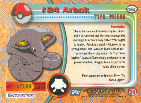 This is the final evolutionary step for Ekans, and it is rumored that the ferocious warning markings on Arbok’s belly differ from region to region. Arbok is a deadly Pokémon in the wrong hands, and Jesse of Team Rocket definitely has the wrong hands. In “Dig Those Diglett,” Jesse’s Ekans finally evolves into the powerful Arbok, bringing tears of joy to the nasty villain’s eyes.