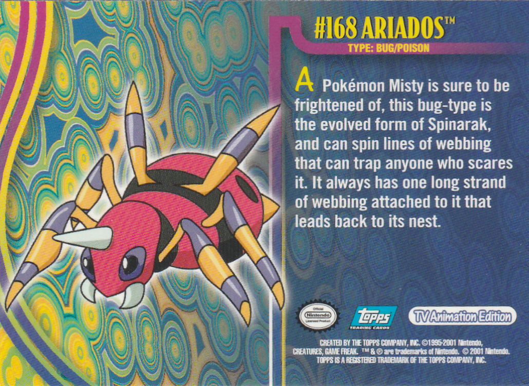 A Pokémon Misty is sure to be frightened of, this bug-type is the evolved form of Spinarak, and can spin lines of webbing that can trap anyone who scares it. It always has one long strand of webbing attached to it that leads back to its nest.