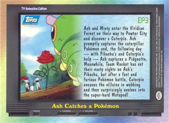 Ash and Misty enter the Viridian Forest on their way to Pewter City and discover a Caterpie. Ash promptly captures the caterpillar Pokémon and, the following day — with Pikachu’s and Caterpie’s help — Ash captures a Pidgeotto. Meanwhile, Team Rocket has set their nasty sights on Ash’s Pikachu, but after a fast and furious Pokémon battle, Caterpie encases the villains in webbing and then surprisingly evolves into the super-hard Metapod!