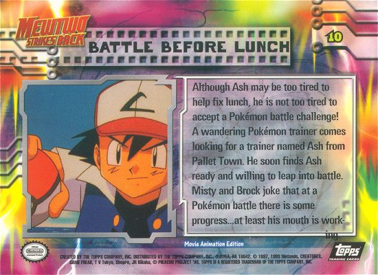 Although Ash may be too tired to help fix lunch, he is not too tired to accept a Pokémon battle challenge! A wandering Pokémon trainer comes looking for a trainer named Ash from Pallet Town. He soon finds Ash ready and willing to leap into battle. Misty and Brock joke that at a Pokémon battle there is some progress…at least his mouth is working.