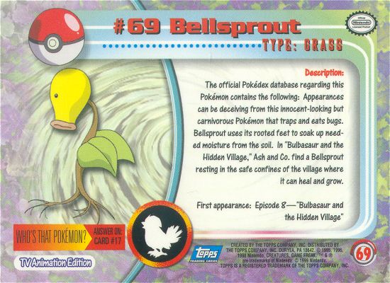 The official Pokédex database regarding this Pokémon contains the following: Appearances can be deceiving from this innocent-looking but carnivorous Pokémon that traps and eats bugs. Bellsprout uses its rooted feet to soak up needed moisture from the soil. In “Bulbasaur and the Hidden Village,” Ash and Co. find a Bellsprout resting in the safe confines of the village where it can heal and grow.
