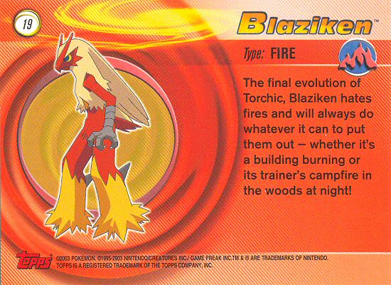 The final evolution of Torchic, Blaziken hates fires and will always do whatever it can to put them out — whether it’s a building burning or its trainer’s campfire in the woods at night!