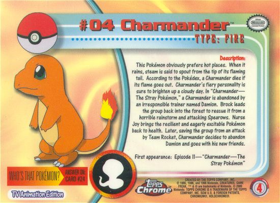 This Pokémon obviously prefers hot places. When it rains, steam is said to spout from the tip of its flaming tail. According to the Pokédex, a Charmander dies if its flame goes out. Charmander’s fiery personality is sure to brighten up a cloudy day. In “Charmander – The Stray Pokémon,” a Charmander is abandoned by an irresponsible trainer named Damion. Brock leads the group back into the forest to rescue it from a horrible rainstorm and attacking Spearows. Nurse Joy brings the resilient and eagerly excitable Pokémon back to health. Later, saving the group from an attack by Team Rocket, Charmander decides to abandon Damion and goes with his new friends.