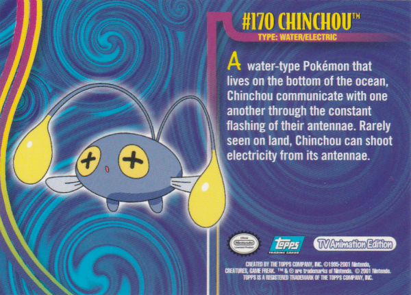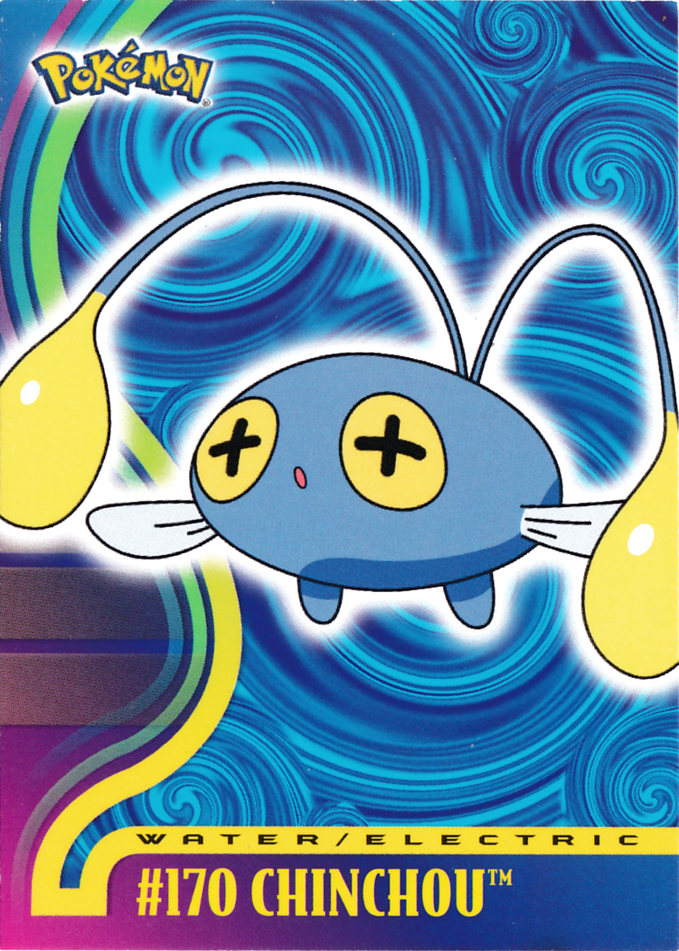 A water-type Pokémon that lives on the bottom of the ocean, Chinchou communicate with one another through the constant flashing of their antennae. Rarely seen on land, Chinchou can shoot electricity from its antennae.