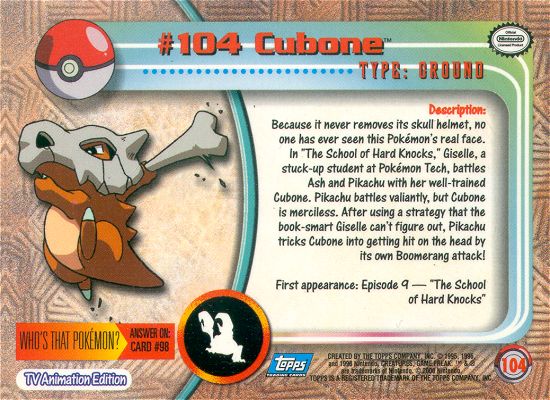 Because it never removes its skull helmet, no one has ever seen this Pokémon’s real face. In “The School of Hard Knocks,” Giselle, a stuck-up student at Pokémon Tech, battles Ash and Pikachu with her well-trained Cubone. Pikachu battles valiantly, but Cubone is merciless. After using a strategy that the book-smart Giselle can’t figure out, Pikachu tricks Cubone into getting hit on the head by its own Boomerang attack!