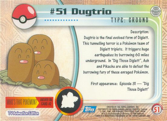 Dugtrio is the final evolved form of Diglett. This tunneling terror is a Pokémon team of Diglett triplets. It triggers huge earthquakes by burrowing 60 miles underground. In “Dig Those Diglett,” Ash and Pikachu are able to defeat the burrowing fury of these enraged Pokémon.