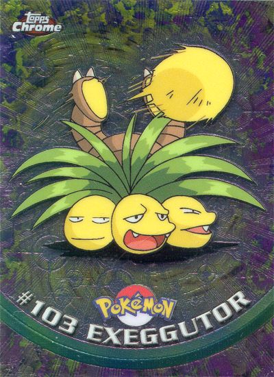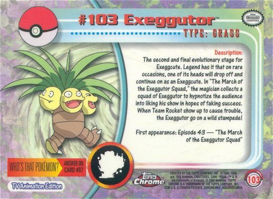 The second and final evolutionary stage for Exeggcute. Legend has it that on rare occasions, one of its heads will drop off and continue on as an Exeggcute. In “The March of the Exeggutor Squad,” the magician collects a squad of Exeggutor to hypnotize the audience into liking his show in hopes of faking success. When Team Rocket show up to cause trouble, the Exeggutor go on a wild stampede!