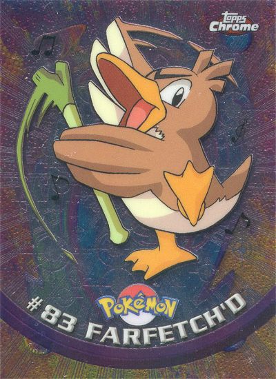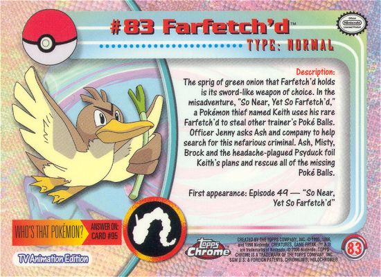 The sprig of green onion that Farfetch’d holds is its sword-like weapon of choice. In the misadventure, “So Near, Yet So Farfetch’d,” a Pokémon thief named Keith uses his rare Farfetch’d to steal other trainer’s Poké Balls. Officer Jenny asks Ash and company to help search for this nefarious criminal. Ash, Misty, Brock and the headache-plagued Psyduck foil Keith’s plans and rescue all of the missing Poké Balls.