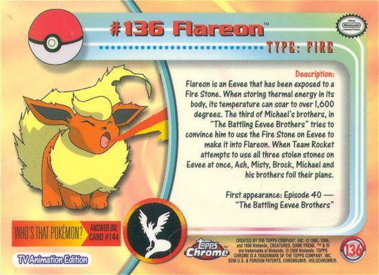 Flareon is an Eevee that has been exposed to a Fire Stone. When storing thermal energy in its body, its temperature can soar to over 1,600 degrees. The third of Michael’s brothers, in “The Battling Eevee Brothers” tries to convince him to use the Fire Stone on Eevee to make it into Flareon. When Team Rocket attempts to use all three stones on Eevee at once, Ash, Misty, Brock, Michael and his brothers foil their plans.