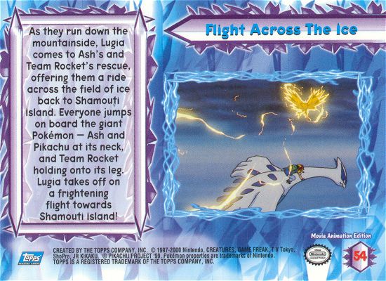 As they run down the mountainside, Lugia comes to Ash’s and Team Rocket’s rescue, offering them a ride across the field of ice back to Shamouti Island. Everyone jumps on board the giant Pokémon — Ash and Pikachu at its neck, and Team Rocket holding onto its leg. Lugia takes off on a frightening flight towards Shamouti Island!