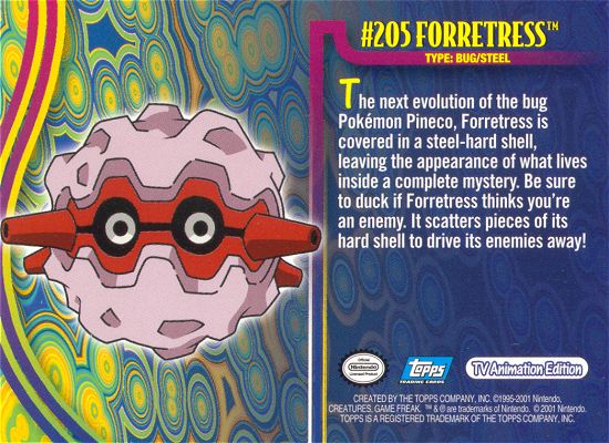 The next evolution of the bug Pokémon Pineco, Forretress is covered in a steel-hard shell, leaving the appearance of what lives inside a complete mystery. Be sure to duck if Forretress thinks you’re an enemy. It scatters pieces of its hard shell to drive its enemies away!