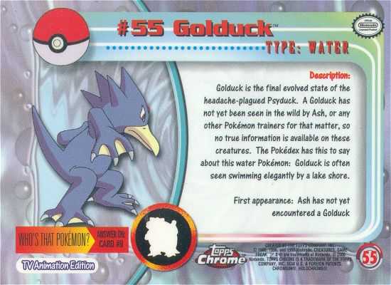Golduck is the final evolved state of the headache-plagued Psyduck. A Golduck has not yet been seen in the wild by Ash, or any other Pokémon trainers for that matter, so no true information is available on these creatures. The Pokémon has this to say about this water Pokémon: Golduck is often seen swimming elegantly by a lake shore.