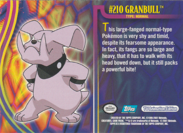 This large-fanged normal-type Pokémon is very shy and timid, despite its fearsome appearance. In fact, its fangs are so large and heavy, that it has to walk with its head bowed down, but it still packs a powerful bite!