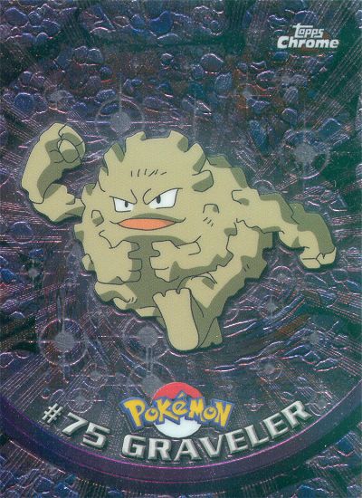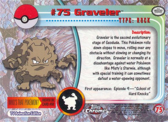 Graveler is the second evolutionary stage of Geodude. This Pokémon rolls down slopes to move, rolling over any obstacle without slowing or changing its direction. Graveler is normally at a disadvantage against water Pokémon like Misty’s Starmie, although with special training it can sometimes defeat a water-spewing opponent.