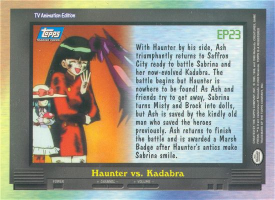 With Haunter by his side, Ash triumphantly returns to Saffron City ready to battle Sabrina and her now-evolved Kadabra. The battle begins but Haunter is nowhere to be found! As Ash and friends try to get away, Sabrina turns Misty and Brock into dolls, but Ash is saved by the kindly old man who saved the heroes previously. Ash returns to finish the battle and is awarded a Marsh Badge after Haunter’s antics make Sabrina smile.