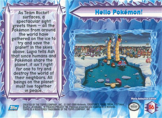 As Team Rocket surfaces, a spectacular sight greets them — all the Pokémon from around the world have gathered on the ice to try and save the planet! In the skies above, Lugia tells Ash that since humans and Pokémon share the planet, it isn’t right for one to try and destroy the world of their neighbors. All beings on the planet must live together in peace.