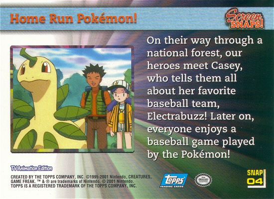 On their way through a national forest, our heroes meet Casey, who tells them all about her favorite baseball team, Electrabuzz! Later on, everyone enjoys a baseball game played by the Pokémon!