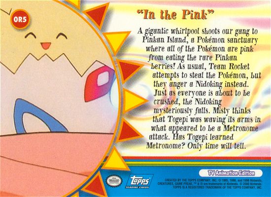 A gigantic whirlpool shoots our gang to Pinkan Island, a Pokémon sanctuary where all of the Pokémon are pink from eating the rare Pinkan berries! As usual, Team Rocket attempts to steal the Pokémon, but they anger a Nidoking instead. Just as everyone is about to be crushed, the Nidoking mysteriously falls. Misty thinks that Togepi was waving its arms in what appeared to be a Metronome attack. Has Togepi learned Metronome? Only time will tell.