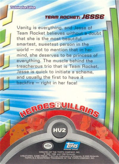 Vanity is everything, and Jesse of Team Rocket believes without a doubt that she is the most beautiful, smartest, sweetest person in the world — not to mention that in her mind, she deserves to be princess of everything. The muscle behind the treacherous trio that is Team Rocket, Jesse is quick to initiate a scheme, and usually the first to have it backfire — right in her face!