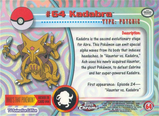 Kadabra is the second evolutionary stage for Abra. This Pokémon can emit special alpha waves from its body that induces headaches. In “Haunter vs. Kadabra,” Ash uses his newly acquired Haunter, the ghost Pokémon, to defeat Sabrina and her super-powered Kadabra.