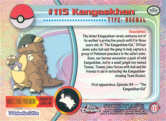 The infant Kangaskhan rarely ventures out of its mother’s protective pouch until it is three years old. In “The Kangaskhan Kid,” Officer Jenny asks Ash and the gang to help capture a group of Pokémon poachers in the safari zone. Soon, our heroes encounter a pack of wild Kangaskhan, led by a small jungle boy named Tommy. Tommy joins forces with Ash and his friends to aid in defeating the Kangaskhan-stealing Team Rocket.