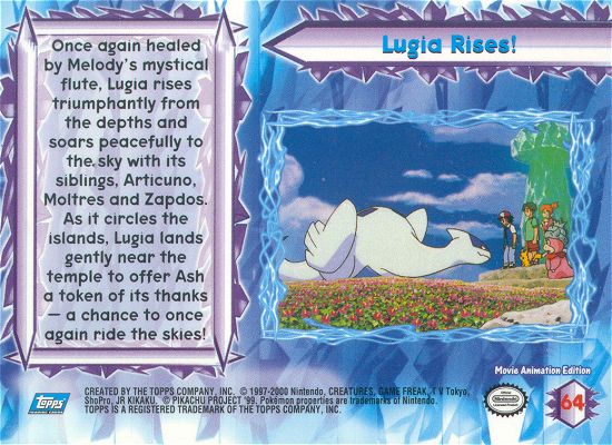 Once again healed by Melody’s mystical flute, Lugia rises triumphantly from the depths and soars peacefully to the sky with its siblings, Articuno, Moltres and Zapdos. As it circles the islands, Lugia lands gently near the temple to offer Ash a token of its thanks — a chance to once again ride the skies!