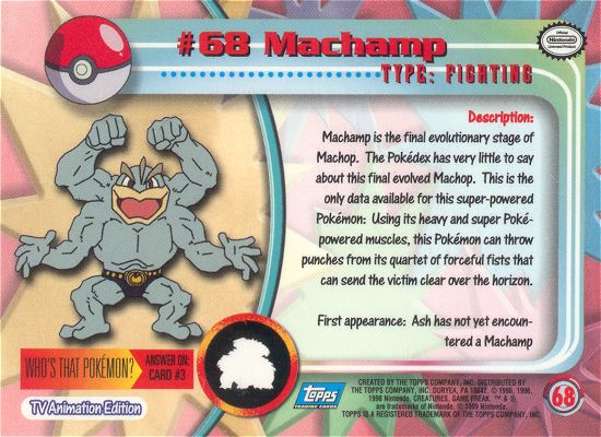 Machamp is the final evolutionary stage of Machop. The Pokédex has very little to say about this final evolved Machop. This is the only data available for this super-powered Pokémon: Using its heavy and super Poké-powered muscles, this Pokémon can throw punches from its quartet of forceful fists that can send the victim clear over the horizon.