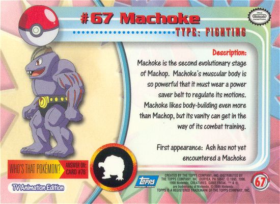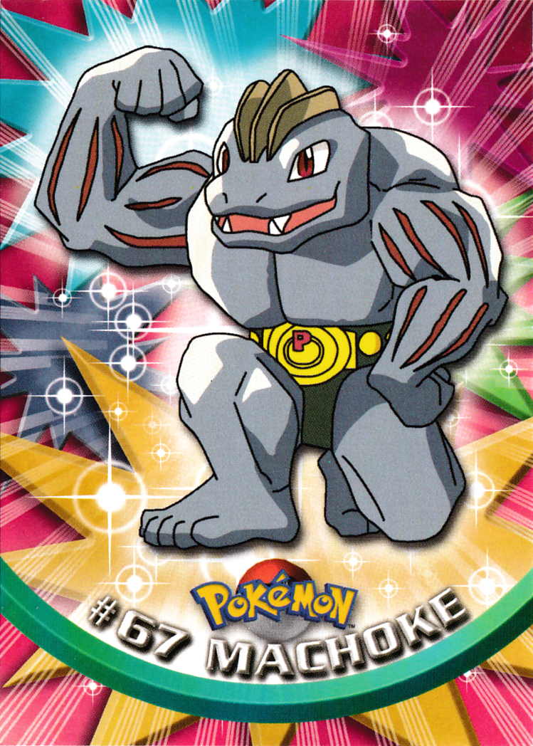 Machoke is the second evolutionary stage of Machop. Machoke’s muscular body is so powerful that it must wear a power saver belt to regulate its motions. Machoke likes body-building even more than Machop, but its vanity can get in the way of its combat training.