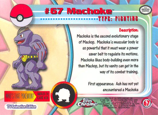 Machoke is the second evolutionary stage of Machop. Machoke’s muscular body is so powerful that it must wear a power saver belt to regulate its motions. Machoke likes body-building even more than Machop, but its vanity can get in the way of its combat training.