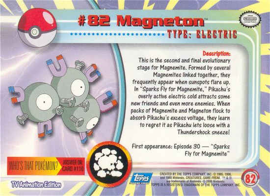 This is the second and final evolutionary stage for Magnemite. Formed by several Magnemites linked together, they frequently appear when sunspots flare up. In “Sparks Fly for Magnemite,” Pikachu’s overly active electric cold attracts some new friends and even more enemies. When packs of Magnemite and Magneton flock to absorb Pikachu’s excess voltage, they learn to regret it as Pikachu lets loose with a Thundershock sneeze!