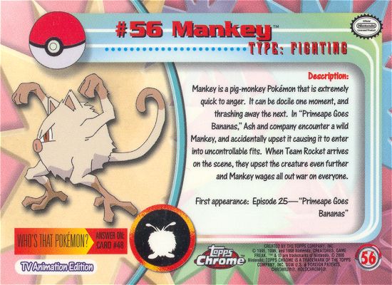Mankey is a pig-monkey Pokémon that is extremely quick to anger. It can be docile one moment, and thrashing away the next. In “Primeape Goes Bananas,” Ash and company encounter a wild Mankey, and accidentally upset it causing it to enter into uncontrollable fits. When Team Rocket arrives on the scene, they upset the creature even further and Mankey wages all out war on everyone.