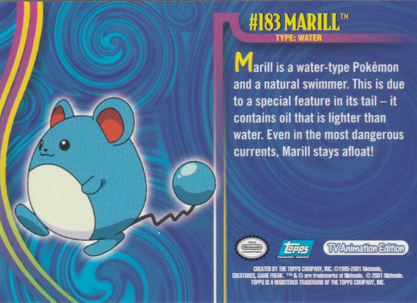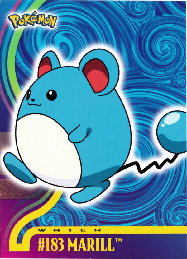Marill is a water-type Pokémon and a natural swimmer. This is due to a special feature in its tail — it contains oil that is lighter than water. Even in the most dangerous currents, Marill stays afloat!