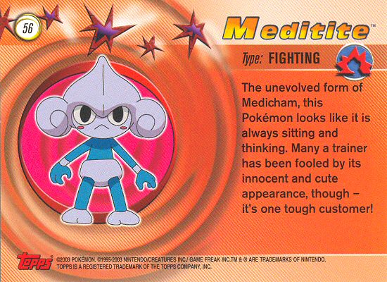 The unevolved form of Medicham, this Pokémon looks like it is always sitting and thinking. Many a trainer has been fooled by its innocent and cute appearance, though — it’s one tough customer!