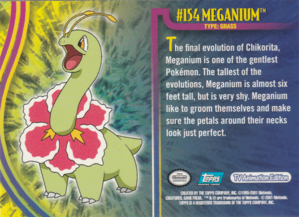 The final evolution of Chikorita, Meganium is one of the gentlest Pokémon. The tallest of the evolutions, Meganium is almost six feet tall, but is very shy. Meganium like to groom themselves and make sure the petals around their necks look just perfect.
