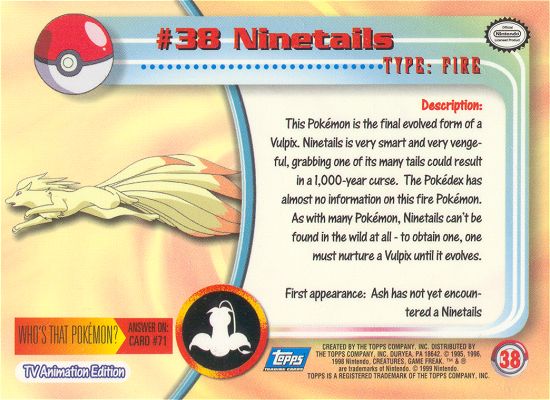 This Pokémon is the final evolved form of a Vulpix. Ninetails is very smart and very vengeful, grabbing one of its many tails could result in a 1,000-year curse. The Pokédex has almost no information on this fire Pokémon. As with many Pokémon, Ninetails can’t be found in the wild at all – to obtain one, one must nurture a Vulpix until it evolves.
