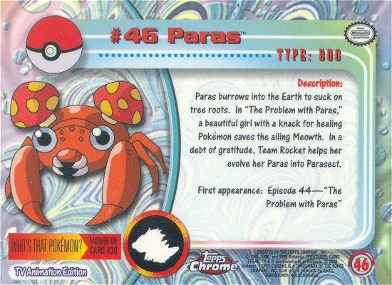 Paras burrows into the Earth to suck on tree roots. In “The Problem with Paras,” a beautiful girl with a knack for healing Pokémon saves the ailing Meowth. In a debt of gratitude, Team Rocket helps her evolve her Paras into Parasect.
