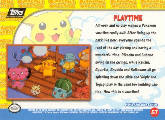 All work and no play makes a Pokémon vacation really dull! After fixing up the park like new, everyone spends the rest of the day playing and having a wonderful time. Pikachu and Cubone swing on the swings, while Raichu, Squirtle, Buru and Bulbasaur all go spiraling down the slide and Vulpix and Togepi play in the sand box building castles. Now this is a vacation!
