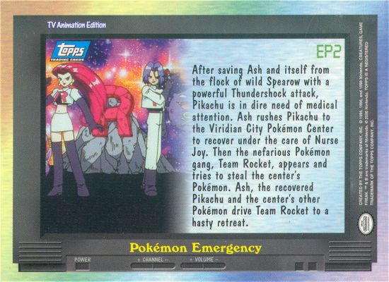 After saving Ash and itself from the flock of wild Spearow with a powerful Thundershock attack, Pikachu is in dire need of medical attention. Ash rushes Pikachu to the Viridian City Pokémon Center to recover under the care of Nurse Joy. Then the nefarious Pokémon gang, Team Rocket, appears and tries to steal the center’s Pokémon. Ash, the recovered Pikachu and the center’s other Pokémon drive Team Rocket to a hasty retreat.