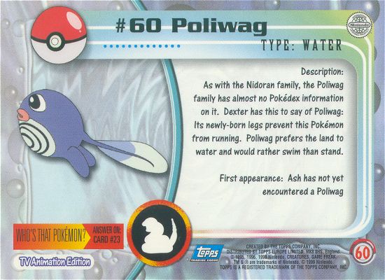 As with the Nidoran family, the Poliwag family has almost no Pokédex information on it. Dexter has this to say of Poliwag: Its newly-born legs prevent this Pokémon from running. Poliwag prefers the land to water and would rather swim than stand.